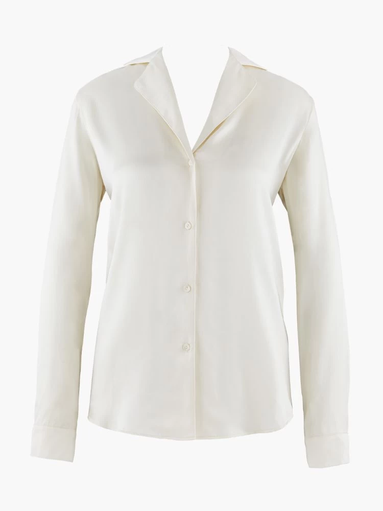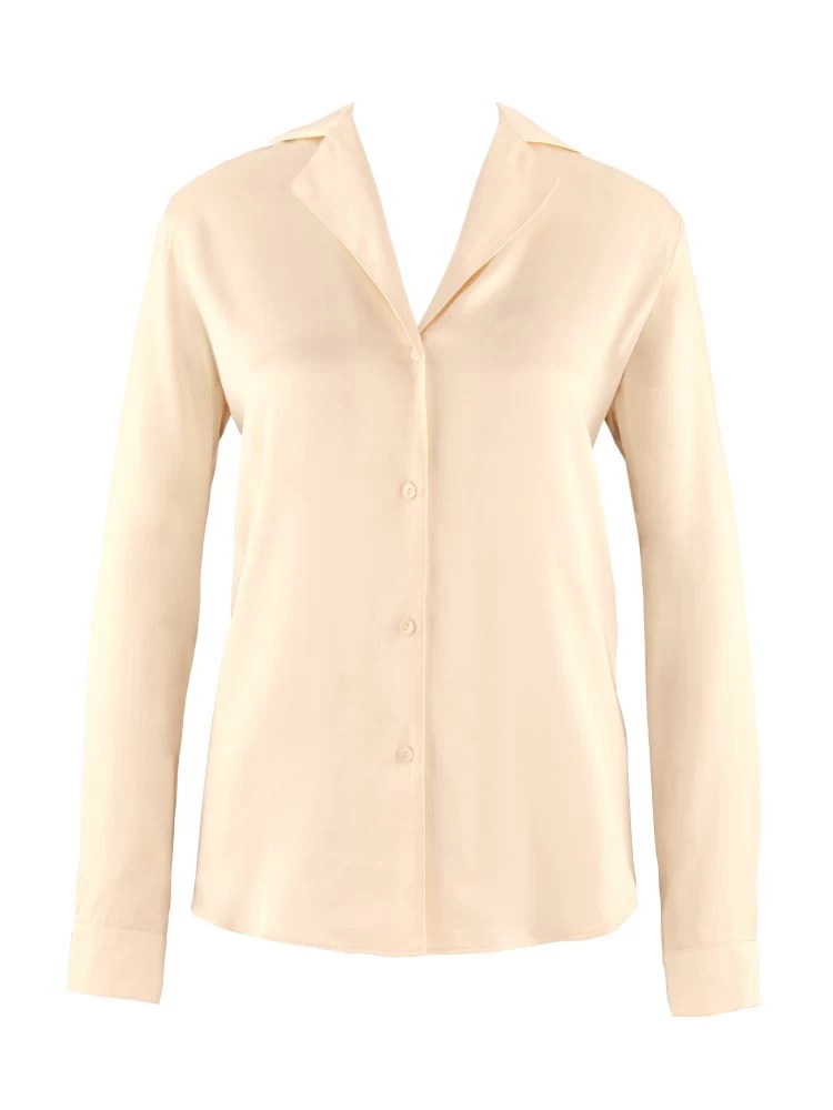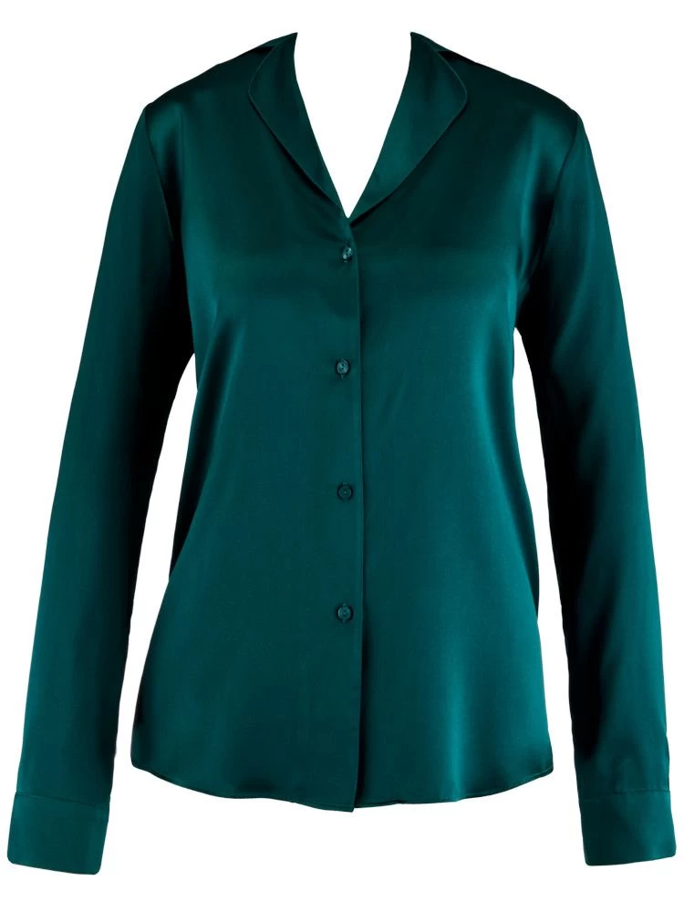 Die Bluse mit langen Ärmeln hat einen schmalen Reverskragen und ist vorne geknöpft . Diese edle Seidenwäsche ist in den folgenden Farben und Größen erhältlich:
