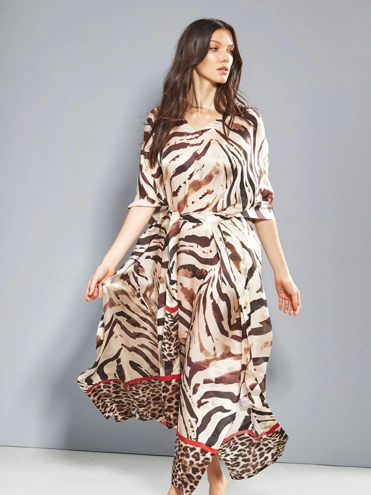 Langer Seiden Kaftan mit einer Neuinterpretation von Animal Print. Das verfremdete Zebramuster ist als platzierter Druck auf einem Seidensatin aus 100% Seide ausgeführt, wodurch dieser Seidenkaftan besonders edel wirkt. Der Kaftan hat einen V-Ausschnitt und kann mit dem zugehörigen Bindegürtel zu einem bequemen Hauskleid oder Sommerkleid drapiert werden.