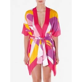 Dieser moderne, kurze Seiden-Kimono von Luna di Seta besticht durch seinen glamourösen Druck in sommerlichen Farben. Der Kimono aus Seidensatin (100% Seide) besteht aus einem großen, bedruckten Tuch (Foulard) mit platziertem Druck. Seitlich ist dieses zusammengenäht, so dass Ärmelöffnungen entstehen. Dieser Kimono hat eine Länge von ca. 90 cm.