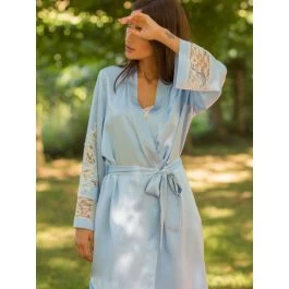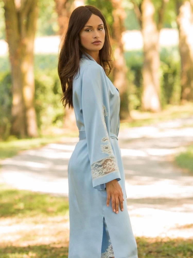 Die französische Caudry Spitze hat einen hohen Baumwollanteil von 76% und wurde auf auf beiden Ärmeln verwendet. Außerdem sind alle Kanten mit kontrastierenden Biesen abgesetzt. Seitlich ist dieser Kimonomantel hoch geschlitzt. Er wird gewickelt getragen und mit einem Bindegürtel geschlossen. Dieser lange Seiden-Morgenmantel ist ca. 135 cm lang und hat lange Ärmel.