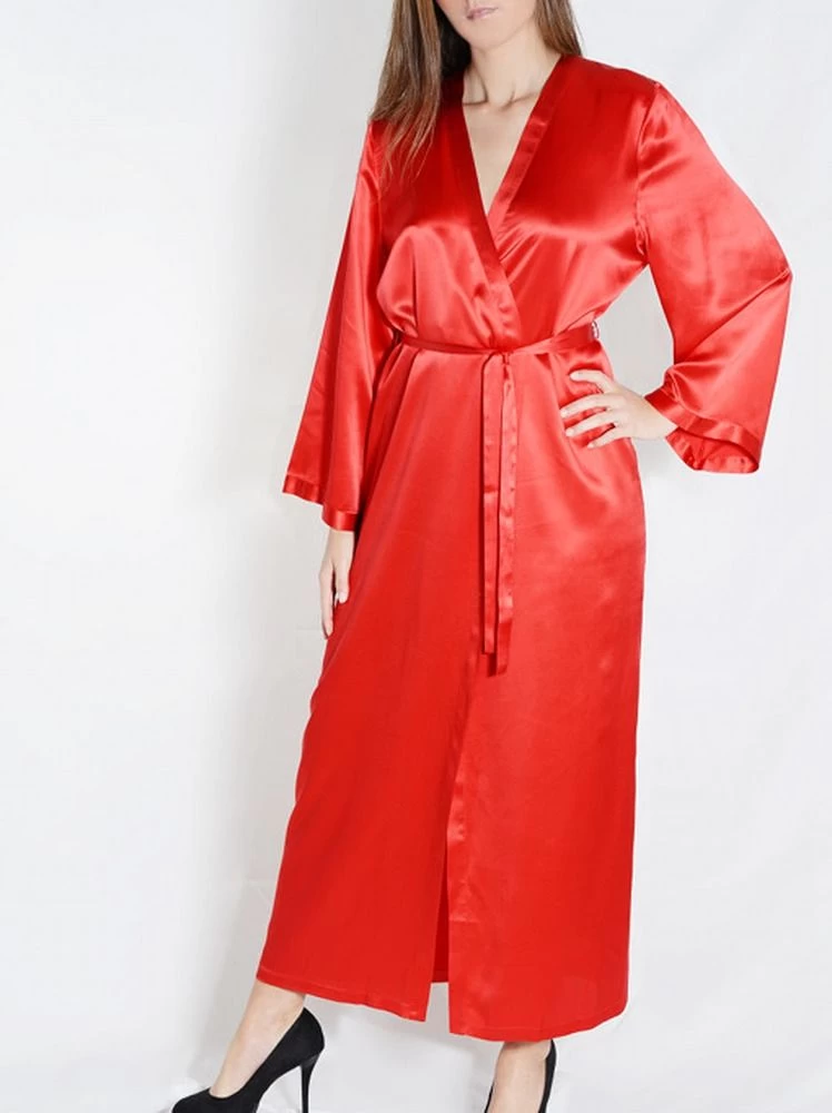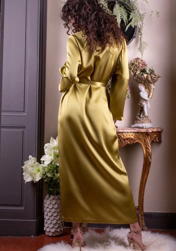 Der lange Seiden-Morgenmantel Laurian der französischen Edel-Marke Marjolaine ist aus feinem Seidensatin (100% Seide) gefertigt. Der hochwertig verarbeitete lange Morgenmantel ist die perfekte Ergänzung zu den Seiden-Nachthemden und Negligés von Marjolaine.