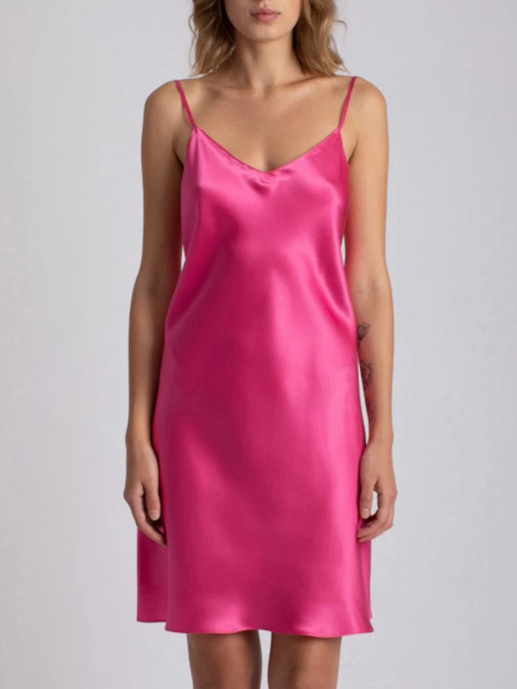 Das knielange Seidennachthemd Caroline ist klassisch geradlinig geschnitten und kann als Nachthemd oder Unterkleid getragen werden. Es hat fein gearbeitete in der Länge verstellbare Spaghetti-Träger und ist in Basicfarben oder saisonalen Modefarben erhältlich.
