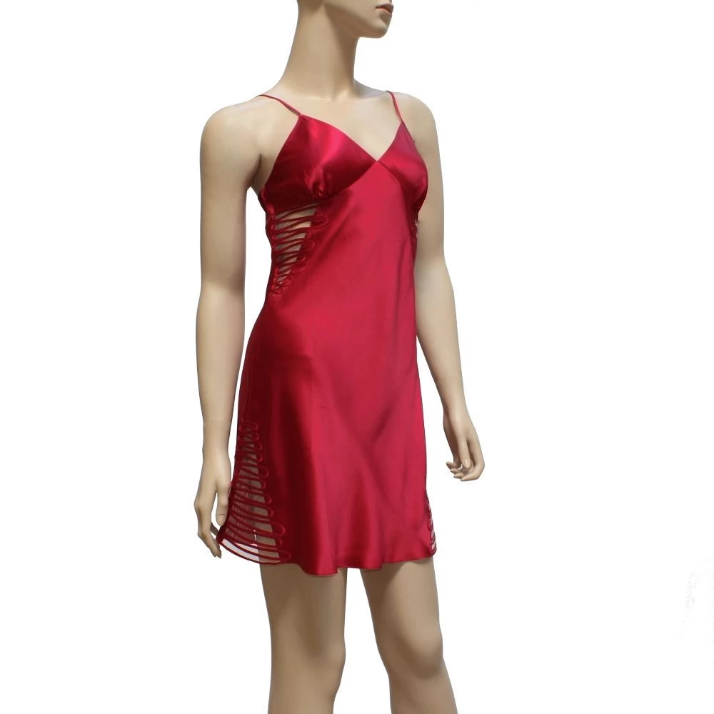 Das kurze Seidennachthemd aus Seiden-Satin hat verführerische, teiltransparente Einsätze aus Tüll. Der feine und sehr weiche Tüll ist mit Satin-Bändern im Soutache Stil benäht, was diesem Seidennachthemd eine feminine Note verleiht. Dieses Seidennachthemd aus leuchtend roter oder ocean-blauer Seide verführt durch die raffinierte seitlichen transparenten Einsätze.