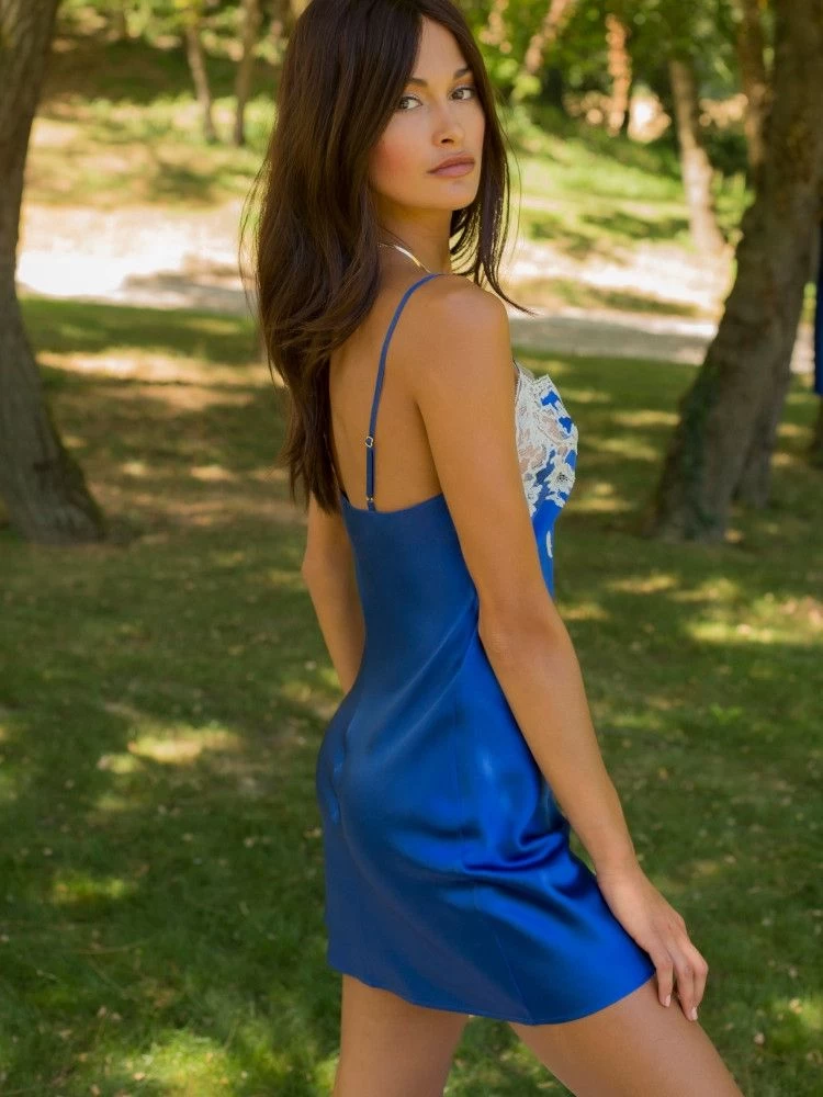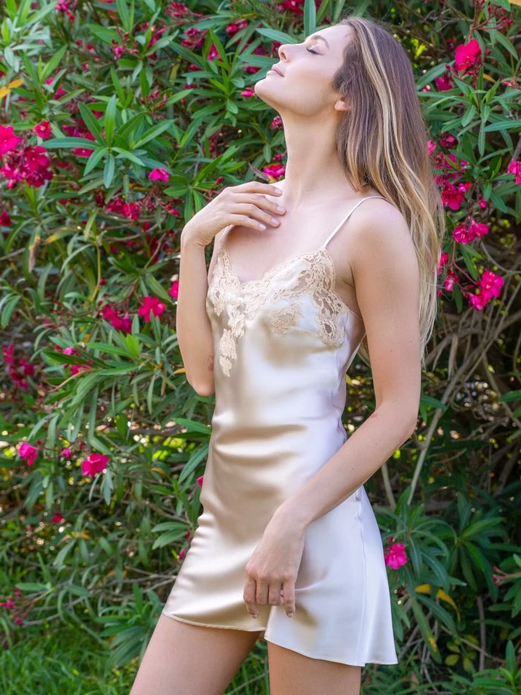 Ein kurzes Nachthemd der Luxusklasse ist das Seidennachthemd Marjolie No. 1 der französischen Edel-Marke Marjolaine. Der edle Seidensatin aus 100% Seide wurde mit exquisiter Spitze aus Calais zu einer bezaubernden Nachtwäsche verarbeitet.