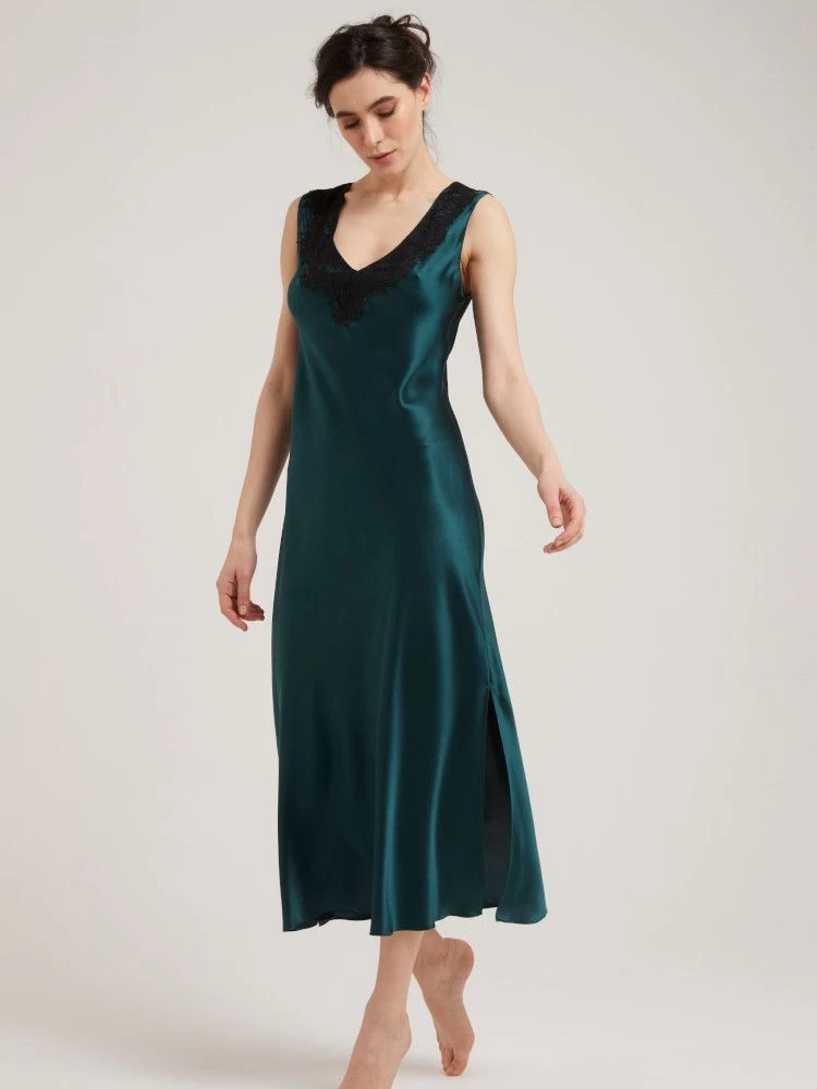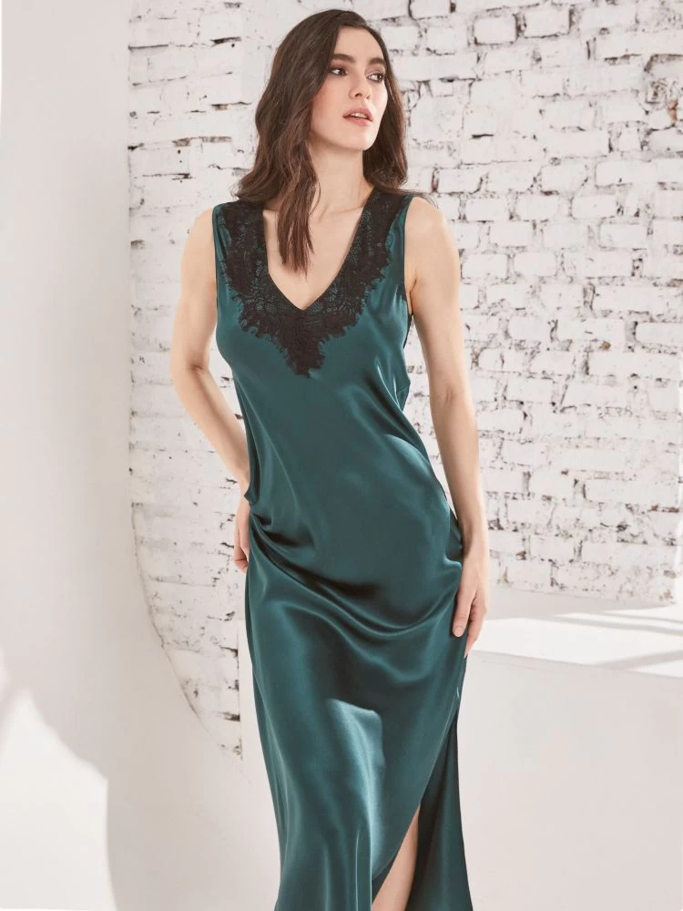 Dieses elegante Seiden-Negligé ist aus hochwertigem Seidensatin (100 % Seide) gefertigt. Das lang geschnittene Seidenkleid in dunkelblau, dunkelgrün oder anthrazit-grau hat einen V-Ausschnitt und breite Träger. Am Decolleté ist es mit elfenbein-weißer oder schwarzer Eye Lash Spitze verziert. Dieses exklusive Seidenneglige des italienischen Nachtwäsche Labels Vivis ist elegant und angenehm auf der Haut.