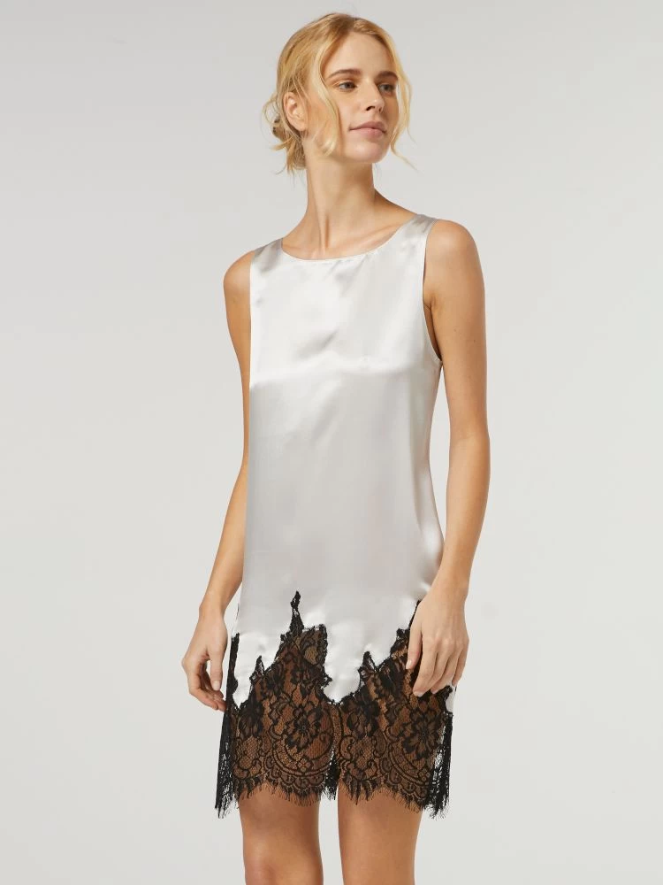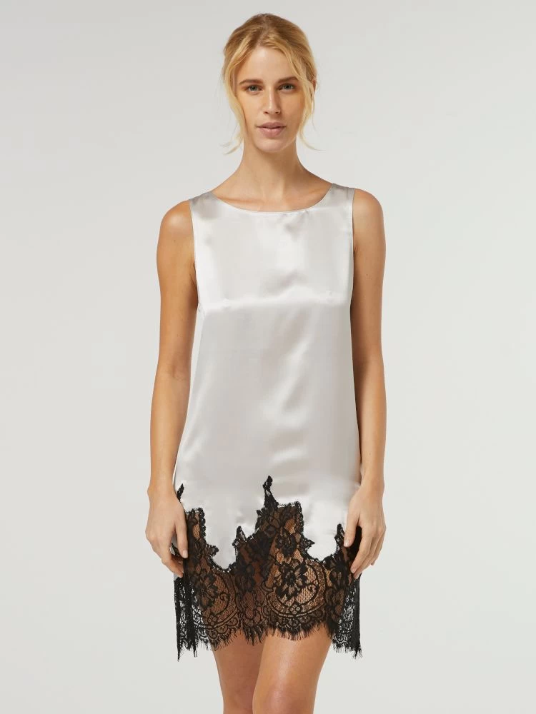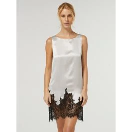 Das kurze Seidennachthemd ist gerade geschnitten. Es ist in der Farbe Silber Grau mit schwarzer Spitze erhältlich.