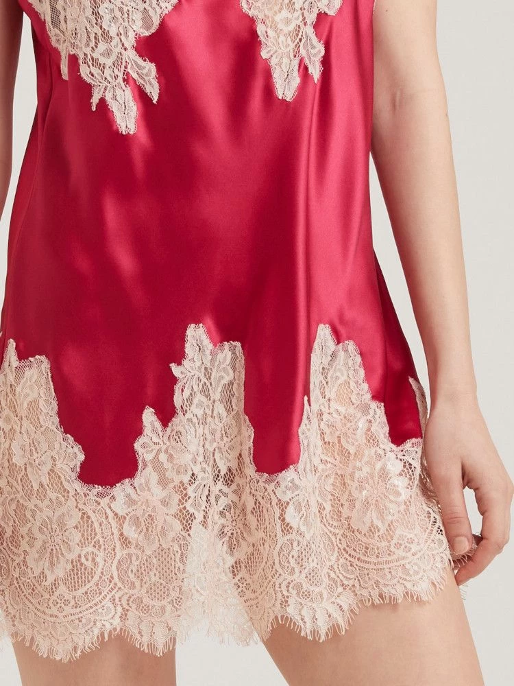 Das kurze Seidennachthemd hat fein gearbeitete in der Länge verstellbare Spaghetti-Träger und ist in der Farbe Geranie-Rot, Himbeer oder Silbergrau mit Spitze erhältlich. Es ist am Decollete transparent aus Spitze gefertigt.