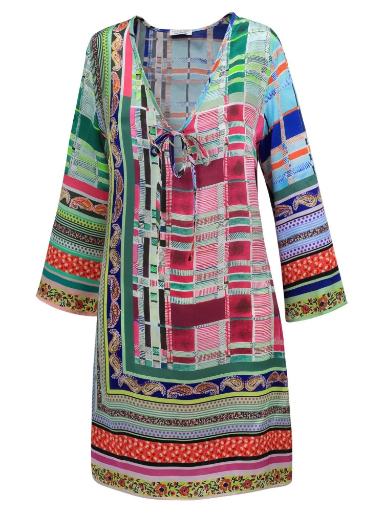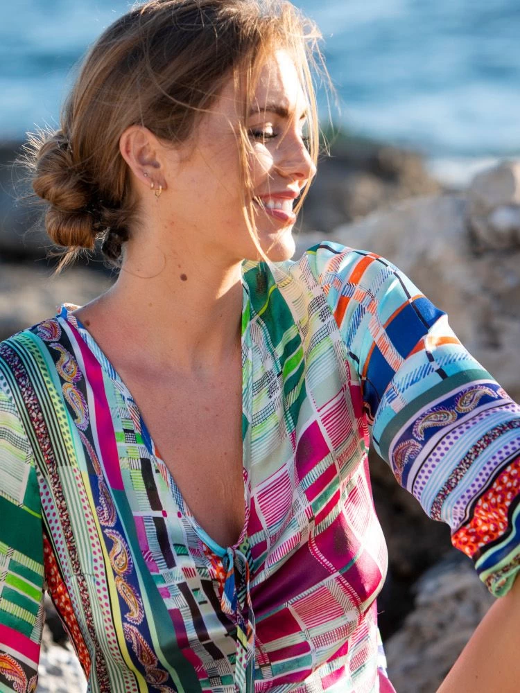 Die Seiden-Tunika mit ihrem zeitlosen Druck ist sowohl als sommerliche Oberbekleidung als auch als angenehme Nachtwäsche oder Homewear zu tragen und ergänzt die aktuelle Bademode optimal. Sie ist in den Größen 36 bis 42 erhältlich.