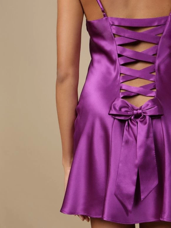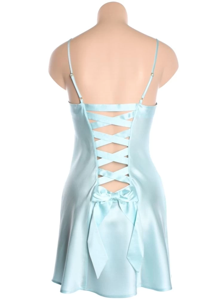 Das Highlight dieses ansonsten schlichten Nachthemdes ist die raffinierte Rückengestaltung mit überkreuzten, geflochtenen Bändern und einer großen Schleife.
