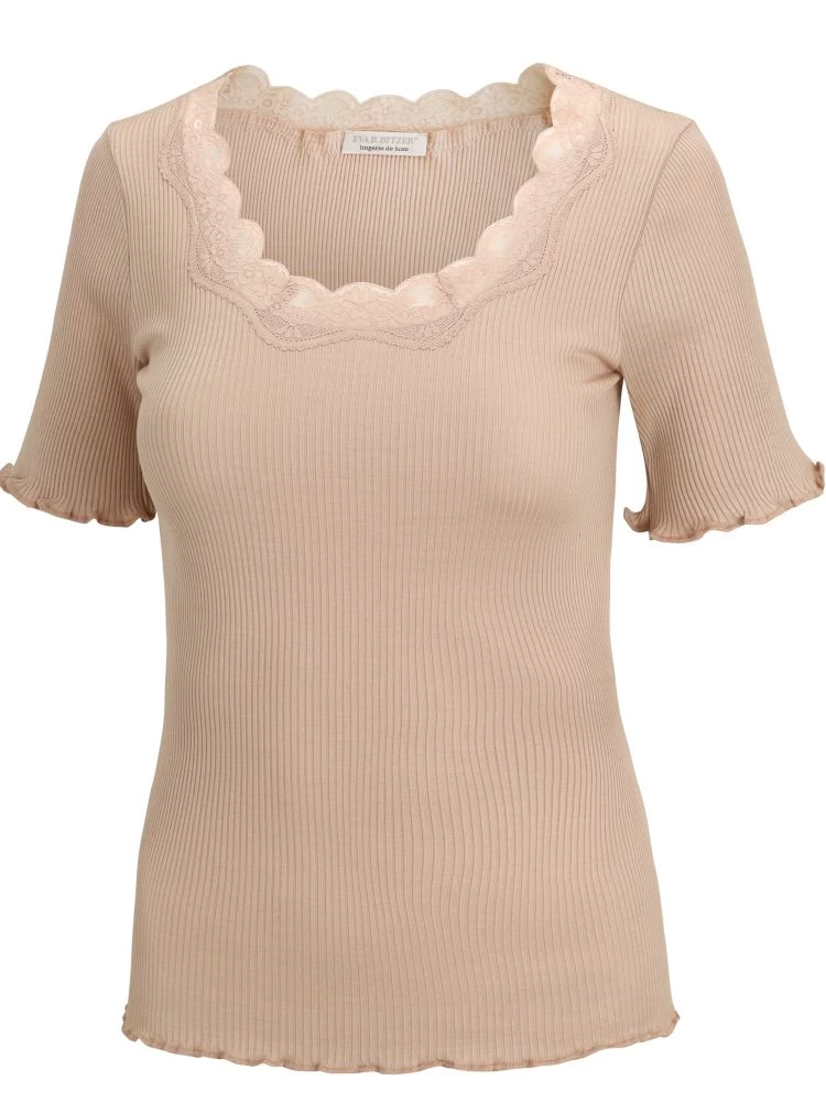 Die Hochwertigkeit des Stoffes (70% Seide, 30% Baumwolle) wird durch den zeitlosen Schnitt und die Verzierung mit floraler Wäschespitze (100% Polyester) unterstrichen. Das Unterhemd hat kurze Ärmel und eine unkomplizierte Passform. Es kann als Oberbekleidungsteil, Unterwäsche oder auch als Nachtwäsche und Homewear getragen werden.