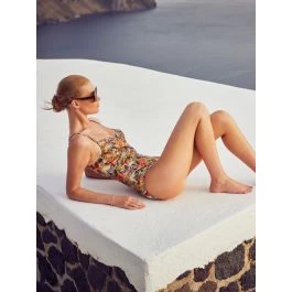 Dieser zeitlose Badenanzug von Fürstenberg überzeugt durch seinen modischen Druck und die exklusive Farbstellung in apricot mit grün. Der Badeanzug hat ein verführerisches Muster mit Zebras, Leopard und Palmenblättern und ist leicht assymetrisch gestaltet, mit seitlicher Raffung.