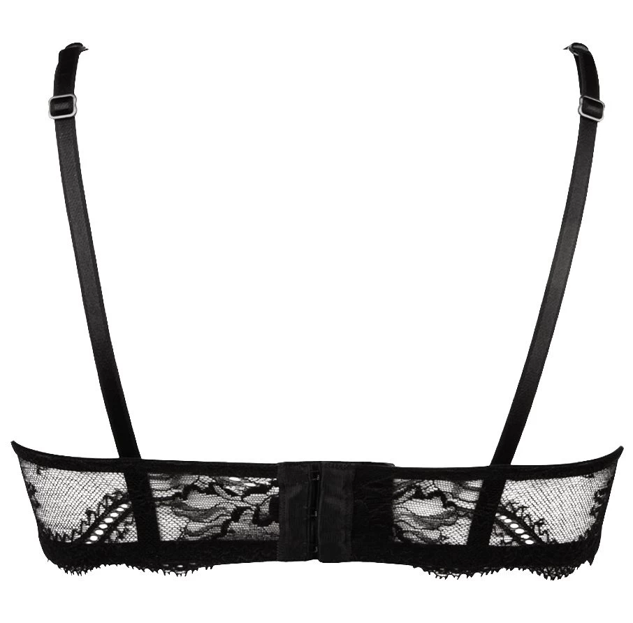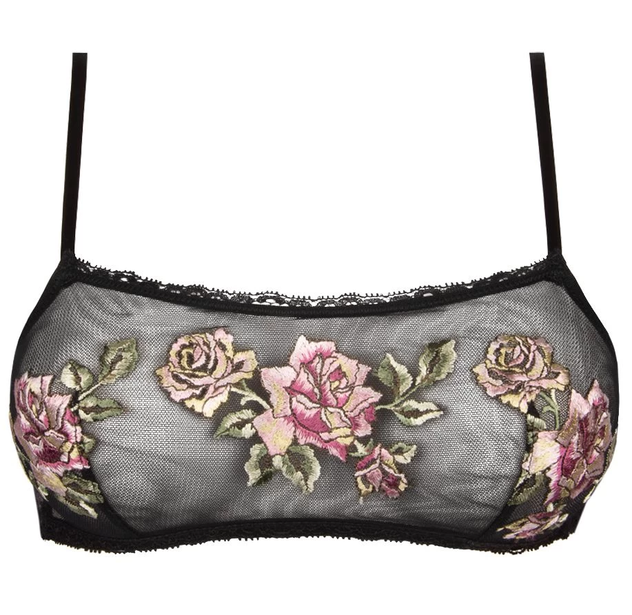 Den verführerischen BH gibt es in der Farbe Rose Ebene, einer schwarzen Spitze mit rosanen Blumenstickereien. Das Dessousoberteil ist in den Größen S bis L erhältlich.