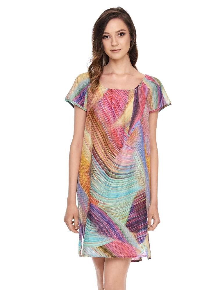Das Kleid mit kurzen Ärmeln von Gattina besteht aus 100% Baumwolle in einer leichten Batist-Qualität. Es hat einen grafischen Druck und ist in in den Größen 36 bis 42 (deutsche Damenkonfektionsgrößen) erhältlich. Ausverkaufte Größen sind hier nicht nachbestellbar. Dieses Dress mit einer Gesamtlänge von ca. 85 cm kann als Nachthemd, Sommerkleid oder Strandkleidung getragen werden.