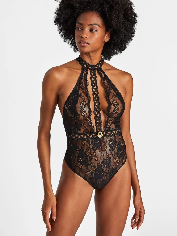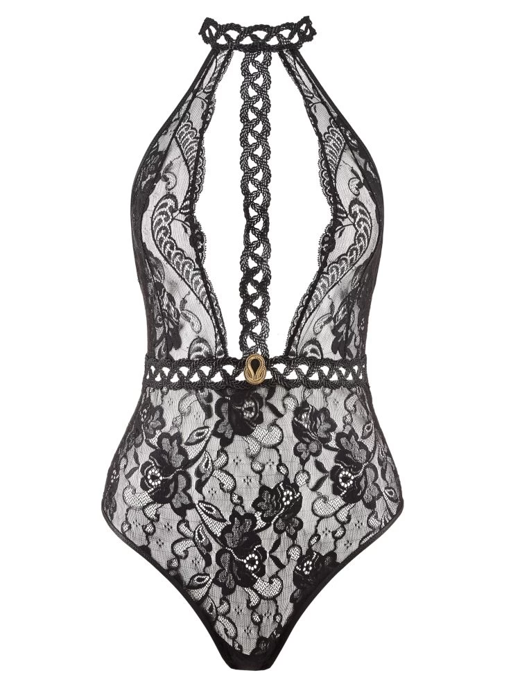 Der Body besteht vorne, sowie an den Seiten aus sehr feiner Leavers Spitze und ist daher leicht transparent. Über Taille, Hals und dem tief ausgeschnittenen Dekolleté zieht sich eine präzise Guipure Borte. Die Stelle an der die Borten von Taille und Dekolleté zusammentreffen ist durch ein Geflecht von goldenen Kettengliedern geziert. Der Rücken ist sehr tief ausgeschnitten und läuft kurz unter dem Steißbein V-förmig zu. Die elastischen Bänder, welche über den Rücken laufen, sind in Bondage-Optik und machen den Einteiler vollständig zu einem unwiderstehlichen Hingucker. Sowohl die feinen Guipure Borten, das offene Dekolleté, als auch der spektakuläre Rücken, enthüllen die Haut auf sinnliche Weise und verleihen dem Body eine erotische Note.