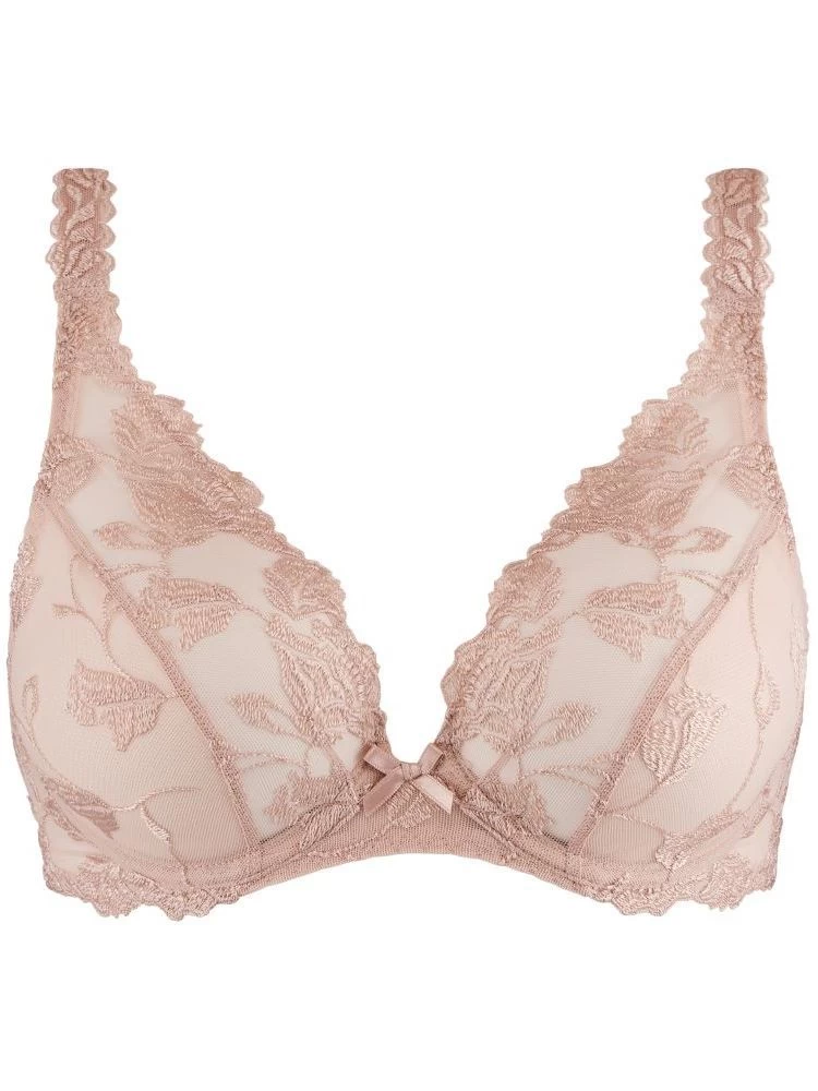 Der Bügel-BH hat nicht wattierte 3/4-Cups in Triangel Form mit Bügel, elastische verstellbare Träger und ist in vielen Größen erhältlich. Er ist für optimalen Komfort und Halt auf der Rückseite mit einem breiteren Rückenstück gestaltet und wird mit einem dreifach verstellbaren Häkchenverschluss geschlossen. Die Cups aus Spitze sind semitransparent.