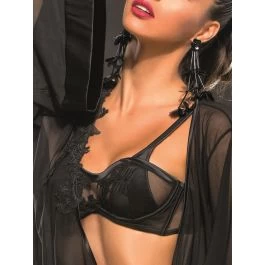 Aus der Kollektion Black Mirror von RCrescentini sind verschiedene, kombinierbare Teile, wie z.B. Slips, Strings, BHs, eine Corsage oder ein kurzer Morgenmantel separat erhältlich.
