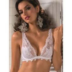 Dieser BH hat elastische, längenverstellbare Träger, welche oben doppelt sind. Die Spitze ist am Träger hochgezogen gearbeitet. Dieser Bralette-BH ist ohne ausgewiesene Cupgröße in den Farben schwarz oder weiß erhältlich: