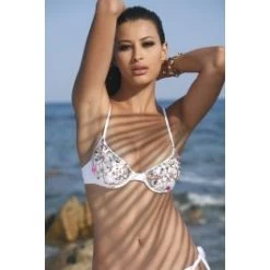 Der Bügel-Bikini Chico von Exilia besteht aus superweichem Feinjersey und ist mit besonders reichen Applikationen verziert. Der Biniki hat ausgeformte Cups in Größe B oder C, welche gefüttert sind und durch eingelegte Pads (herausnehmbar) einen leichten Push-Up Effekt haben. Auf den Cups sind in reiner Handarbeit („Made in Italy“) große Perlmutt-Scheiben, Halbedelsteine und glitzernde Häkel-Litzen aufgenäht.