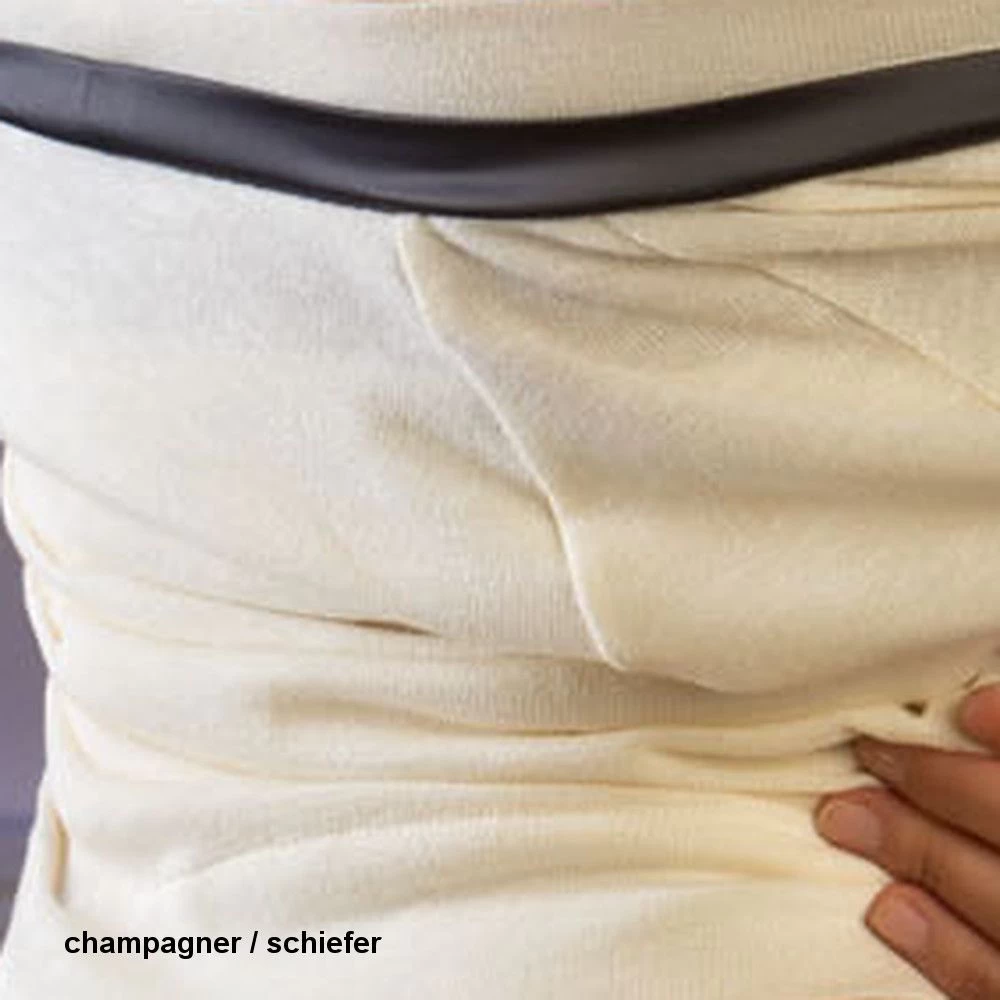 Der Cardigan Syngonium ist in den Farben champagner mit schiefergrau oder bordeaux mit rosa und in den Größen S bis XL erhältlich.
