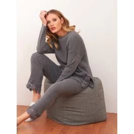 Dieser Hausanzug mit langen Ärmeln und Beinen ist in den Farben grau oder creme-weiß erhältlich. Das Oberteil ist ca. 65 cm lang, hat einen runden Ausschnitt, lange Ärmel und ist seitlich am Saum unten mit einer floralen Häkelspitze besetzt. Die Hose hat einen Gummibund, ist 7/8 lang und an den Beinenden mit Spitze besetzt. Dieser wärmende Hausanzug ist optimal für die Übergangszeit und im Winter. Aus dieser Kollektion gibt es bei uns ergänzende Teile im Shop.