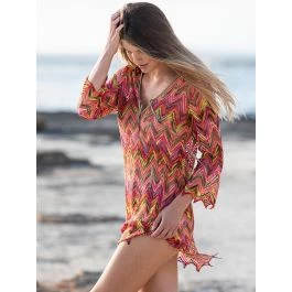 Diese Tunika mit V-Ausschnitt besteht aus einer weichen Polyester Netzspitze mit intensivem Zick Zack Muster in rot, orange und pink. Das Material ist weich und hautschmeichelnd. Die Tunika ist in den Größen 36 bis 44 erhältlich.