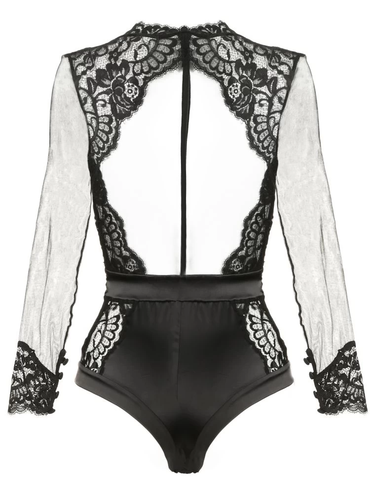 Diese Wäsche aus Spitze hat lange Ärmel aus Tüll mit Spitzenmanschetten, an welchen mit Satin bezogene Zierknöpfe angebracht sind. Seitlich ist ein Reißverschluss angebracht und der Rücken ist transparent. Vorne hat der Body eine Applikation mit Swarovski Crystals Schmuckkristallen. Der Body hat einen Innenzwickel aus Baumwolle und kann im Schritt geöffnet werden.
