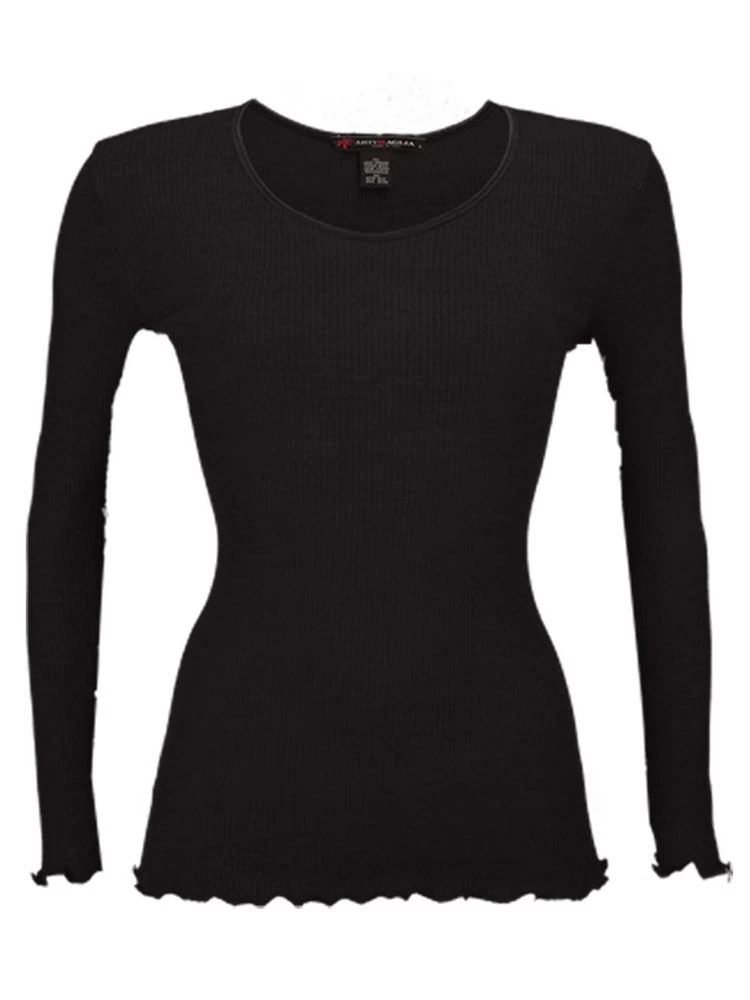 Das Langarm Shirt Wolle-Seide besteht aus einem besonders hochwertigen gerippten Jersey aus 70% extrafeiner Merinowolle und 30% Seide in Kombination mit einer glänzenden Satin-Bordüre. Dieses edle Shirt hat lange Ärmel und eine Gesamtlänge von ca. 60 cm. Das Decolleté ist mit einer glänzenden Satin-Bordüre eingefasst, der untere Saum ist wellig umkettelt.