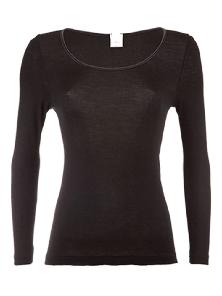 Das Langarm Shirt Wolle-Seide besteht aus einem besonders hochwertigen glatten Jersey aus 70% extrafeiner Merinowolle und 30% Seide in Kombination mit einer glänzenden Satin-Bordüre. Dieses edle Shirt hat lange Ärmel und eine Gesamtlänge von ca. 60 cm. Das Decolleté ist mit einer glänzenden Satin-Bordüre eingefasst.