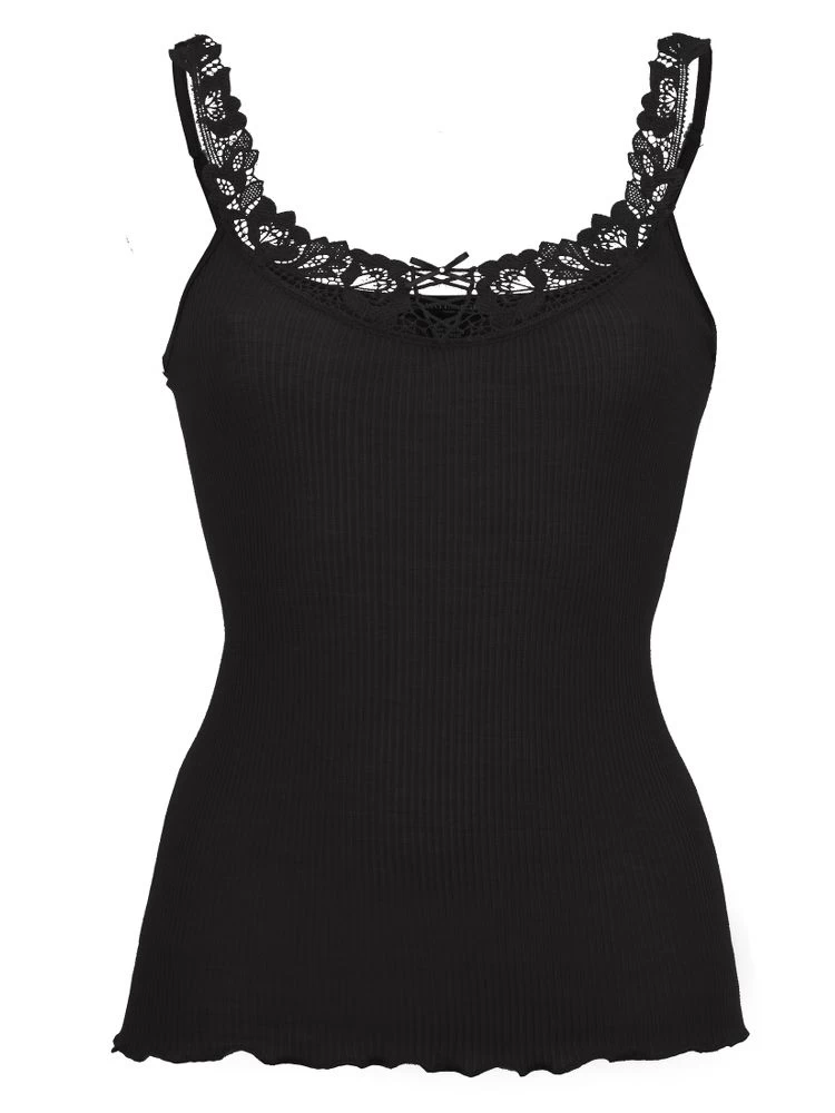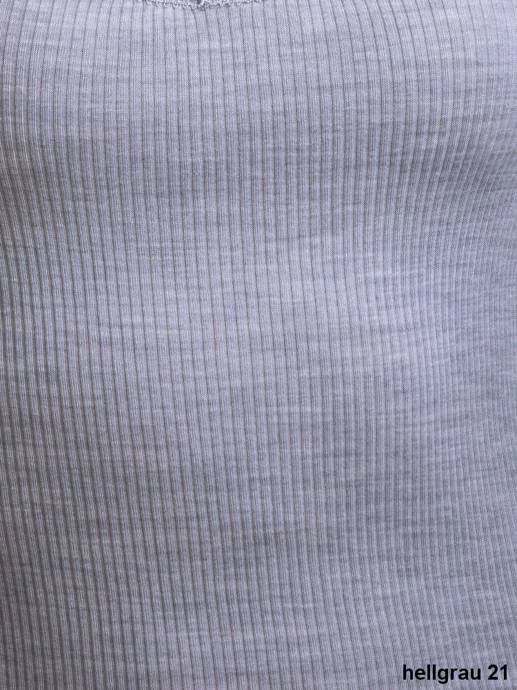 Das feine Träger-Top Wolle-Seide besteht aus einem besonders hochwertigen, rundgestrickten und gerippten Jersey aus 70% extrafeiner Merinowolle und 30% Seide. Dieses edle Shirt mit verstellbaren Trägern ist ca. 60 cm lang. Der untere Saum ist wellig umkettelt. Am Ausschnitt ist dieses Shirt mit einer exquisiten Spitze aus der Schweiz gearbeitet. Das Material ist eine rundgestrickte „Schlauchware“ und daher ist dieses Shirt seitlich nahtlos.