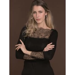 Das Barchetta Shirt Wolle-Seide besteht aus einem besonders hochwertigen glatten Jersey aus 70% extrafeiner Merinowolle und 30% Seide in Kombination mit einer exklusiven französischen Caudry Spitze. Dieses edle Shirt hat lange Ärmel, eine Gesamtlänge von ca. 60 cm und einen weiten U-Boot Ausschnitt. Das Decolleté und die Ärmelenden sind mit Blüten-Spitze gestaltet.