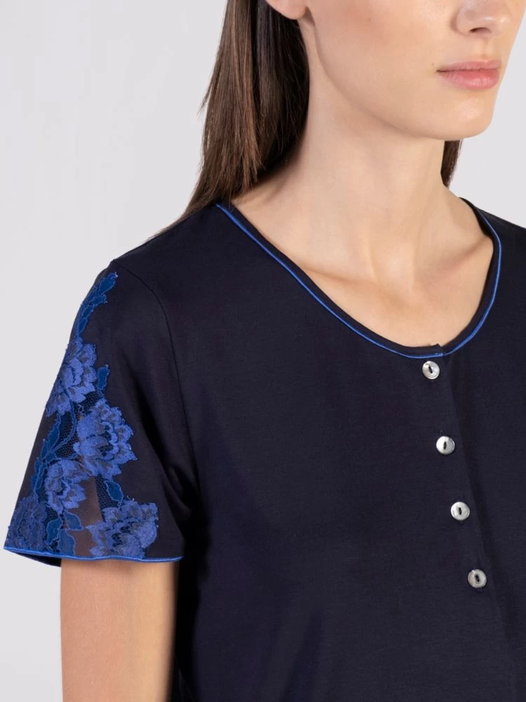 Der Kurzarm-Pyjama von Verdiani Donna besteht aus super-weichem Micro-Modal in einer hautsympathischen, elastischen Jersey-Qualität (92% Modal, 8% Elasthan). Für diese Kollektion wird ein besonders hochwertiger Lenzing Tencel® Markenmodal aus österreichischer Produktion verwendet. Der Pyjama ist Made in Italy und in den Größen 38 bis 44 erhältlich. Der Damen Pyjama hat kurze Ärmel und eine kurze Knopfleiste mit echten Perlmutt Knöpfchen. Die Ärmel sind mit Blumenspitze verziert. Das Oberteil ist ca. 65 cm lang und die lange Hose hat einen Gummibund.
