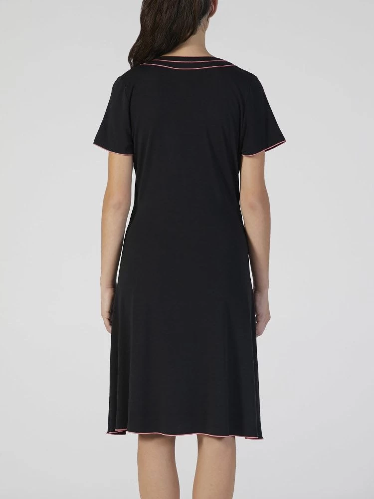 Dieses elegante, knielange Nachtkleid ist bei uns in schwarz mit coral-pinken Kontrastnähten erhältlich.