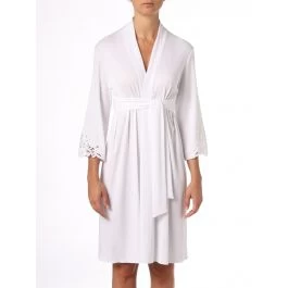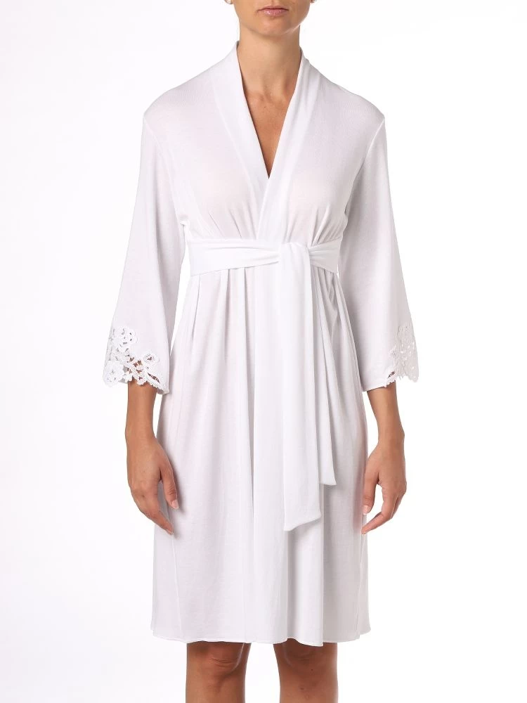 Der Morgenmantel Carola ist in der Farbe weiß und in den Größen 1 bis 5 erhältlich.