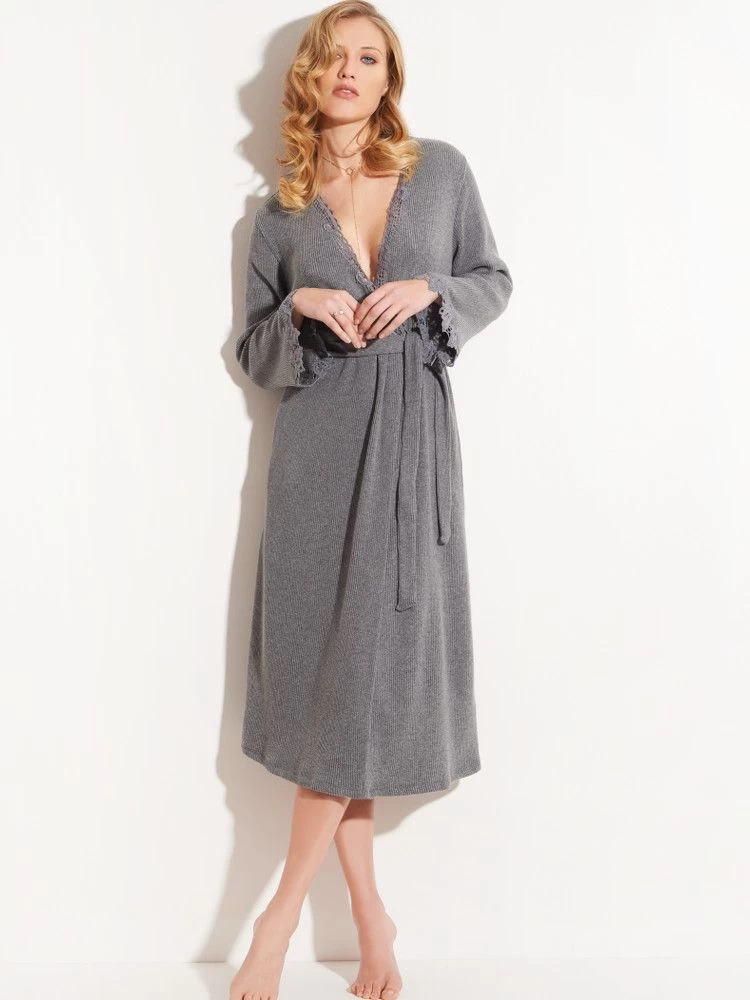 Dieser Morgenmantel mit langen Ärmeln wird gewickelt getragen und ist in den Farben grau oder creme-weiß erhältlich. Er ist ca. 115 cm lang, hat einen Bindegürtel, lange Ärmel und ist am Ausschnitt mit einer floralen Häkelspitze besetzt. Dieser wärmende Morgenmantel ist optimal für die Übergangszeit und im Winter. Aus dieser Kollektion gibt es bei uns ergänzende Teile im Shop.