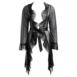 Dieser Morgenmantel ist komplett aus feinem, transparenten Tüll gearbeitet. Er wird gewickelt getragen und mit einem Satin Bindegürtel geschlossen. Die Enden der langen Ärmel, der Saum und das Revers sind mit einem weichen Rüschensaum aus Plisseefalten-Tüll benäht. Die Gesamtlänge ist ca. 95 cm und der Mantel ist komplett transparent und am Ärmel ist ein goldenes Escora Schlüsselchen Schmuckelement angebracht.