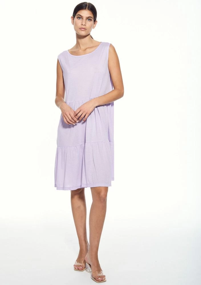 Das Nachthemd hat breite Träger, ist ca. 98 cm lang und ist in der Farbe Flieder in den Größen 36 bis 44 erhältlich.