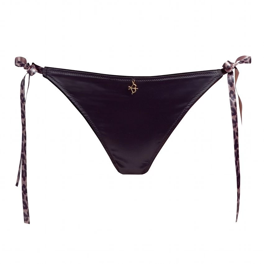 Dieser Ouvert-Slip besteht aus antrazith-farbenem, leicht glänzendem Stretch-Satin. Auf der Rückseite ist der Slip teilweise offen gearbeitet. Den Bund ziert ein kleiner goldener Anhänger des Diamor-Logos und seitliche Schleifen aus rosa Leopard-Print Satin.