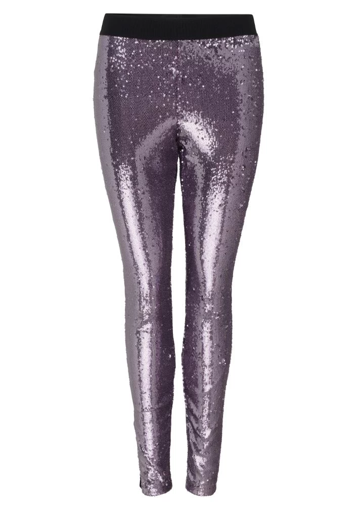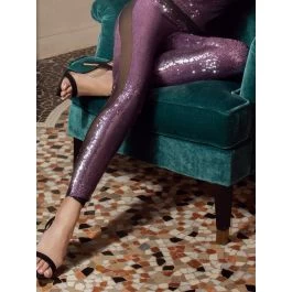 Diese glamouröse Leggings ist vorne und hinten mit lila Pailletten verziert. Sie hat komplett ein eingenähtes Innenfutter aus schwarzem Tüll. Seitlich ist der Tüll ohne Paillettenbesatz und somit transparent. Die Leggings Hose hat einen breiten Gummibund.