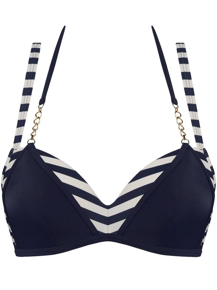Dieser Marlies Dekkers Push Up Bikini ist aus der modischen Bademode-Kollektion von Marlies Dekkers und nicht nachbestellbar. Die Serie Maritime Blue ist in der Farbe dunkelblau, creme gestreift mit gold erhältlich. Es gibt diesen Bikini mit B bis C- Cup in den deutschen Damengrößen 70 bis 80.