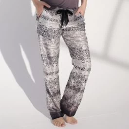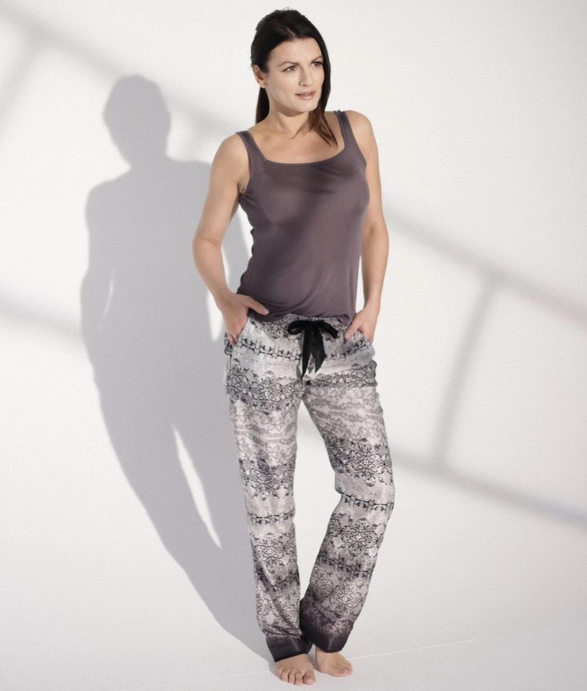 Das Hose mit Gummibund von Gattina besteht aus fein glänzendem Seidensatin (65% Baumwolle, 35% Seide). Sie hat einen grafischen Druck in grau, schwarz und creme und ist in in den Größen 36 bis 48 (deutsche Damenkonfektionsgrößen) erhältlich. Ausverkaufte Größen sind hier nicht nachbestellbar. Diese Hose kann als Schlafwäsche, Lounge-Wear oder Sommerkleidung getragen werden.