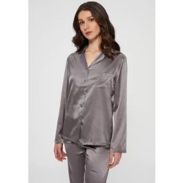 Der Pyjama mit langen Ärmeln von Chiara Fiorini besteht aus Seide in einer elastisch gewebten Qualität (96% Seide, 4% Elasthan). Er ist Made in Italy und in den Größen 34 bis 52 erhältlich. Dieser klassisch geschnittene Schlafanzug hat ein durchgehend geknöpftes Oberteil mit langen Ärmeln und eine Hose mit Gummibund und Bindebändchen. Die Knöpfe des Oberteils sind mit Stoff bezogen und auf der Brust ist eine Tasche aufgenäht.