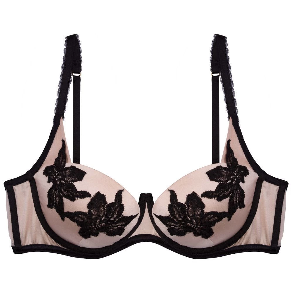 Der Push-Up BH hat leicht gefütterte 3/4 Cups mit Bügel. Die Schalen sind auch auf der Innenseite mit Seidensatin ausgekleidet – so trägt man die feine Seide direkt auf der Haut. Auf der Außenseite sind die Cups mit Blüten aus Calais-Spitze belegt, welche mit schwarzen Strasskristallen geziert wird.