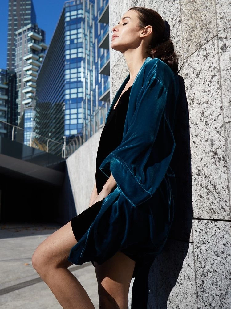 Dieser kuschelige, kurze Samt-Morgenmantel ist aus einem ganz besonderen Material gefertigt: Kuscheliger Samt (82% Viscose, 18% Seide) ist zu einem wunderschönen Winteraccessior mit weitem Schnitt geworden. Der kurz geschnittene Samtmantel wird gewickelt getragen und mit einem Bindegürtel geschlossen. Er hat einen Reverskragen, ist ca. 90 cm lang und hat auf beiden Seiten Manteltaschen eingenäht.