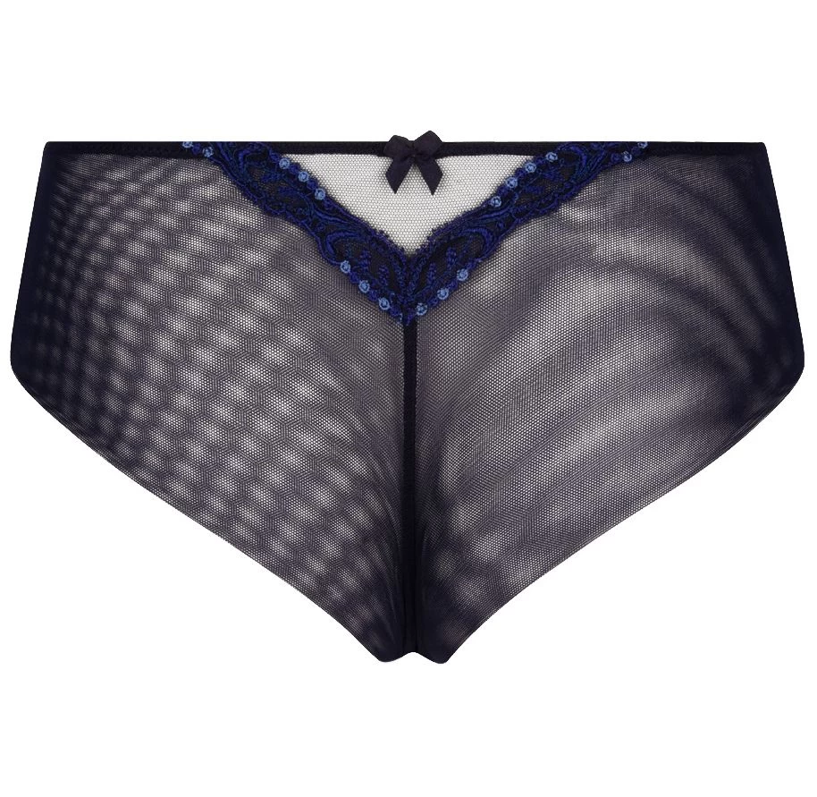 Der bezaubernde Slip ist vorne aus feiner Seide und besticktem Tüll. Die Seiten und die Rückseite sind komplett aus Tüll und daher leicht transparent. Hinten ist eine kleine Stickerei V-Förmig angebracht, um mehr Form und Linie in den Slip zu bringen. Diese Detail ist zusätzlich mit einer zarten Zierschleife versehen. Der Slip ist in knapper Panty/Shorty Form geschnitten und erzeugt somit einen frechen und zugleich verführerischen Look. Das Panty hat einen weichen Baumwollzwickel. Der aufregende Schnitt, die hochwertigen Materialien und zarten Details machen aus diesem Slip ein aufregendes, unwiderstehliches Wäscheunterteil, dass sowohl für den Alltag als auch für besondere Anlässe perfekt geeignet ist. Aus dieser zarten Kollektion gibt es weitere, ergänzende Kombinationsteile seperat in unserem Shop.