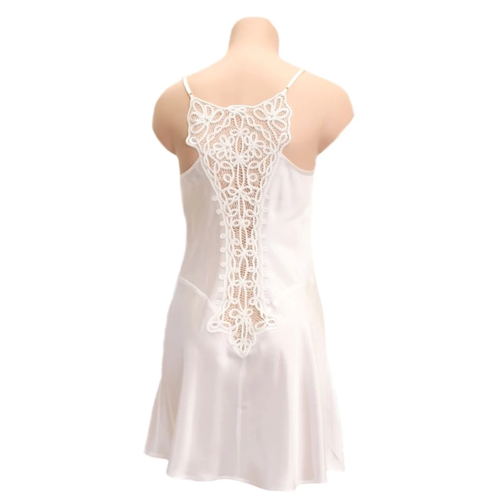 Das Highlight dieses ansonsten schlichten Nachthemdes ist die raffinierte Rückengestaltung aus Seidenbändern mit Hohlsaum-Stickerei im Soutache Stil.