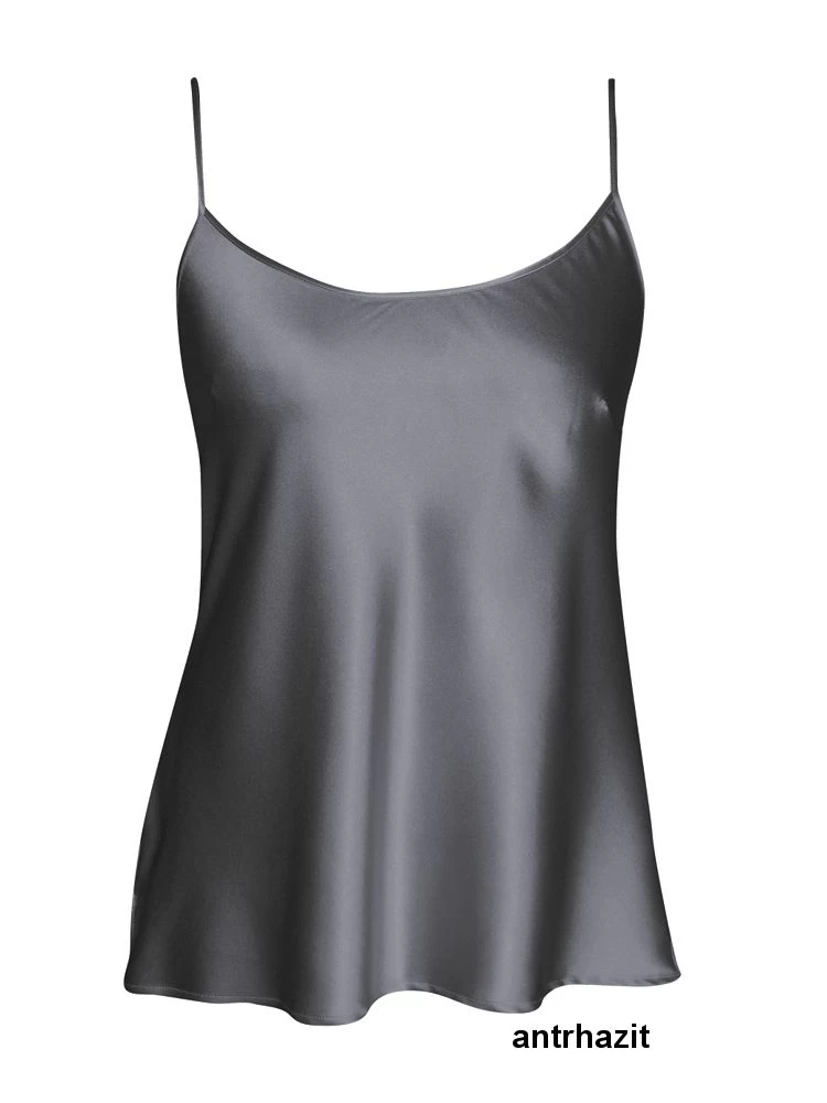 Das in leichter A-Linie geschnittene Seidentop mit verstellbaren Spaghetti- Trägern ist besonders kombinationsfreudig: Es ist als Oberbekleidung oder als Unterwäsche zu verwenden und mit der separat erhältlichen Pyjamahose oder Shorts kann man es in einen seidigen Pyjama oder Hausanzug verwandeln. Das Spaghettiträger-Top ist etwa 65 cm lang und in den folgenden Farben erhältlich: