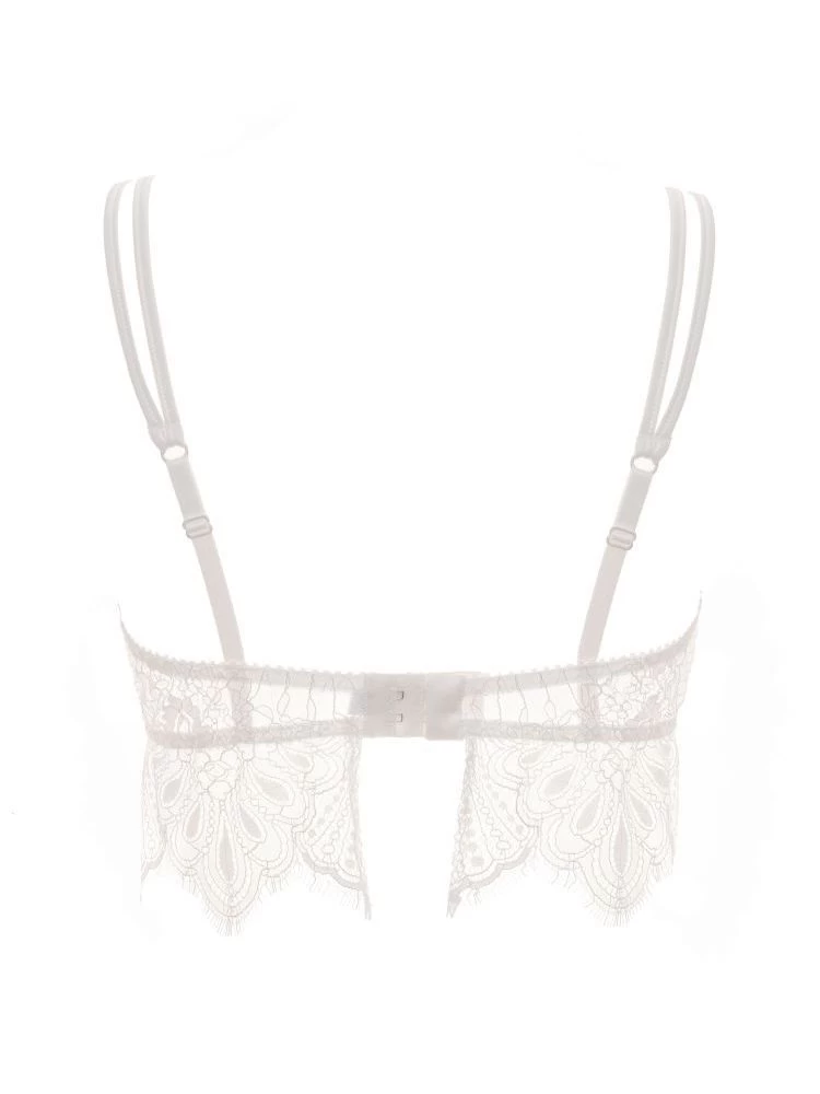 Der Bralette-BH von Prelude Milano ist Spitzenwäsche Made in Europe. Das edle Teil besteht aus floraler Eye-Lash-Spitze und ist länger geschnitten. Die Cups sind nicht gefüttert und nicht geschäumt und somit transparent.