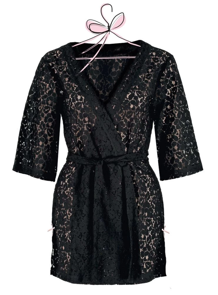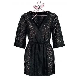 Dieser kurze Morgenmantel aus Spitze mit einer Gesamtlänge von ca. 75 cm ist in den Größen S bis XL erhältlich.