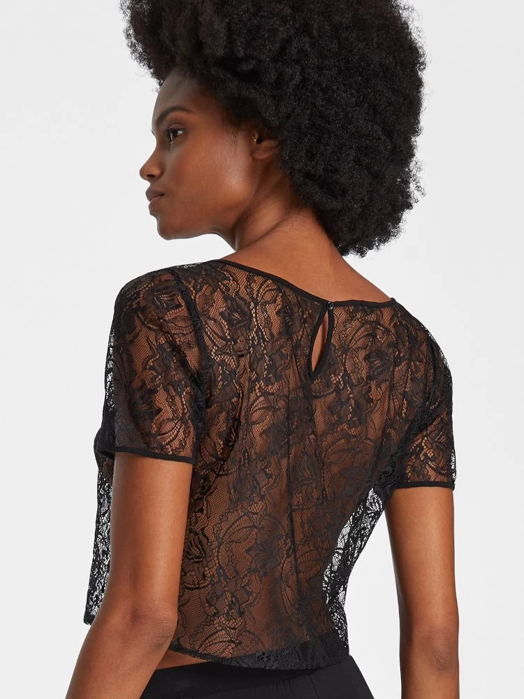 Das elegante Spitzentop hat einen runden Ausschnitt, kurze Ärmel und geht mit 48cm etwa bis zur Taille. Der semitransparente Stoff lässt die Haut durchschimmern und enthüllt sie auf sinnliche Weise. Der kastige Schnitt vereint mit der zarten Spitze macht aus diesem Top eine gelungene Kombination aus aufregender Modernität und stilvoller Klassik.