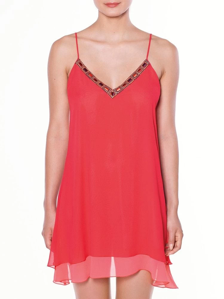 Dieses verspielte, kurze Strandkleid von Luna di Seta besticht durch seine feminine Form und die intensive Farbe. Der Strandkleid aus Crepe (100% Polyester) ist doppellagig, rot mit erdbeer-rosé abgefüttert und ist am Ausschnitt vorne und hinten mit einer dekorativen bestickten Bordüre besetzt. Dieses Strandkleid hat eine Länge von ca. 86 cm.